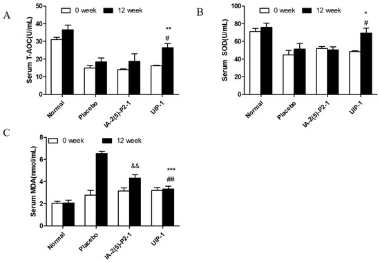 Effect of UIP-1 on serum SOD and T-AOC activity and MDA concentrations in the serum of mice. T-AOC (A), SOD (B) and MDA (C) levels in every group were determined. Data are expressed as the mean ± SEM (n = 3). * p < 0.05, ** p < 0.01, *** p < 0.001; UIP-1 versus placebo group. # p < 0.05, ## p < 0.01; UIP-1 versus IA-2(5)-P2-1 group. && p < 0.01; IA-2(5)-P2-1 versus placebo group, one-way ANOVA.