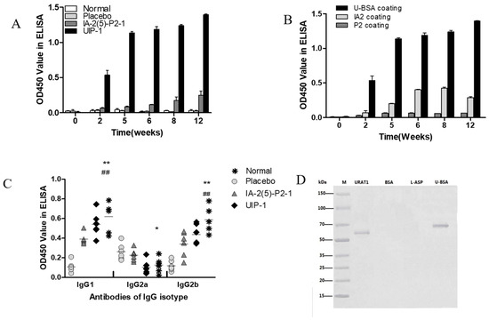 In the UIP-1 group, we analyzed the relative avidity of antibodies against URAT1. Briefly, a 96-well ELISA plate was coated with 100 µL of U-BSA, IA2-BSA, and P2-BSA (Shanghai glbiochem Co., Ltd., Shanghai, China), diluted with 0.1 M carbonate bicarbonate buffer (pH = 9.5) and kept overnight at 4 °C. The following step was similar to the ELISA method mentioned above.