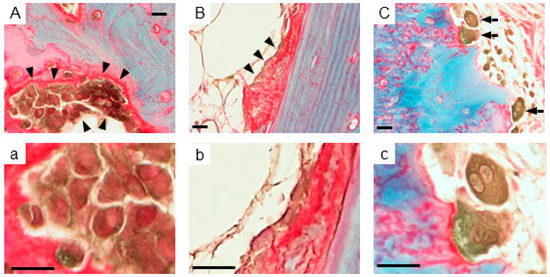 Immunohistochemistry of AhR in bone tissues. (A,B). AhR immunoreactivity (brown) was detected in osteoblasts (arrowheads); (a) and (b) are high magnifications of (A) and (B), respectively. AhR was detected at high levels in the cytoplasm (brown) and low levels in nuclei (reddish-brown). (C). AhR immunoreactivity (brown) was detected in osteoclasts (arrows); (c) is a high magnification of (C). Relatively high levels of AhR immunoreactivity were detected in both cytoplasm and nucleus. No AhR immunoreactivity was detected in (D) chondrocytes and (E) bone stromal cells. Collagen protein was stained red. Non-collagen proteins including calcified bone matrix were stained bluish-green. Both cytoplasm and nuclei were stained red using the K61 Collagen Stain Kit (Collagen Research Center, Kiyose, Tokyo, Japan). Scale bar, 5 μm. AhR, aryl hydrocarbon receptor.
