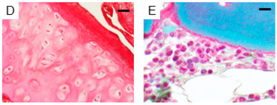 AhR immunoreactivity was detected in the cytoplasm of epithelial cells on the bronchiole (data not shown). In bone (Figure 1), AhR immunoreactivity was detected in both the nuclei and cytoplasm of osteoblasts, which were located on the collagen-positive (red stained area) osteoid surface (Figure 1(Aa,Bb)). Osteoclasts, multinucleated cells in bone resorption cavities, were also positive for AhR (Figure 1Cc). There was no AhR immunoreactivity in chondrocytes (Figure 1D) and bone stromal cells (Figure 1E), respectively.