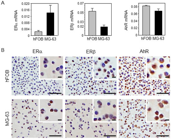 Expressions of ERα, ERβ, and AhR were analyzed using real-time PCR and immunocytochemistry. The methodology of real-time PCR is described in Section 4.5. Real-Time PCR. For immunocytochemical analysis, cultured hFOB, and MG-63 cells were trypsinized and collected in 1.5-mL sample tubes. After centrifugation, cell pellets were fixed for 5 min in 10% neutral buffered formalin (Wako Pure Chemical) and congealed in iPGell (GenoStaff, Tokyo, Japan). iPGell clots were then embedded in paraffin. Antibodies employed in immunocytochemical analysis were as follows: ERα, mouse monoclonal 6F11 (Leica, Wetzlar, Germany); ERβ, mouse monoclonal 14C8 (GeneTex, Irvine, CA, USA); and AhR, rabbit polyclonal (BIOMOL) antibodies.