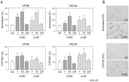 Immunocytochemical analysis revealed that both aromatase and CYP1B1 were not detected in control hFOB cells, whereas they were detected following 3-MC (10 μM) treatment (Figure 3B).