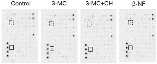 Interleukin (IL)-1β and IL-6 immunoreactivity was detected in 3-MC-treated hFOB cells, but not in control hFOB cells (Figure 4). The immunoreactivity was inhibited by co-treatment of CH-223191 with 3-MC. Both IL-1β and IL-6 were also detected in hFOB cells treated with β-NF. There were no significant differences of other cytokines as the results of cytokine antibody array in hFOB cells treated with either 3-MC or β-NF.