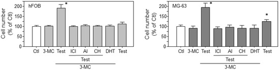 The co-treatment with testosterone, the endogenous aromatase substrate, and 3-MC significantly increased the cell numbers in both hFOB (p < 0.0001) and MG-63 (p < 0.0001) cells compared to those in controls (Figure 5). This increased cell number was significantly inhibited by co-treatment with estrogen blocker (ICI 182,780), aromatase inhibitor (Aromatase inhibitor I), or AhR antagonist (CH-223191). The co-treatment with 3-MC and dihydrotestosterone (DHT) exerted no effects upon the cell numbers of either hFOB or MG-63 cells. Treatment with testosterone alone significantly increased the number of MG-63 cells (p = 0.0004), but not of hFOB cells.