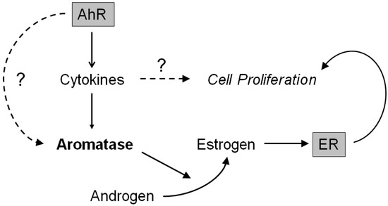 - Saito, R.; Miki, Y.; Hata, S.; Ishida, T.; Suzuki, T.; Ohuchi, N.; Sasano, H. Aryl hydrocarbon receptor induced intratumoral aromatase in breast cancer. Breast Cancer Res. Treat. 2017, 161, 399–407. [Google Scholar] [CrossRef] [PubMed]