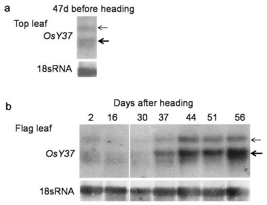Northern hybridization analysis of OsY37 gene transcript accumulation during leaf senescence. Rice cv. “Akitakomachi” top leaves were harvested at 47 d before heading (a) and flag leaves after heading dates (b). Total RNA was extracted from the leaves of several plants at the same growth stages. RNA (20 µg) was separated by agarose/formaldehyde gel electrophoresis, blotted onto a nylon membrane, and allowed to hybridize with the [α-32P]-dCTP-labeled 251 bp OsY37I segment (Figure S2). Thick and thin arrows point to 1 and 3–4 kb transcripts, respectively. The same membrane was re-hybridized with cDNA of Arabidopsis thaliana 18S rRNA as a loading control, which is shown below the OsY37I segment-probed hybridization. After hybridization, the membrane was washed under high stringency washing conditions.