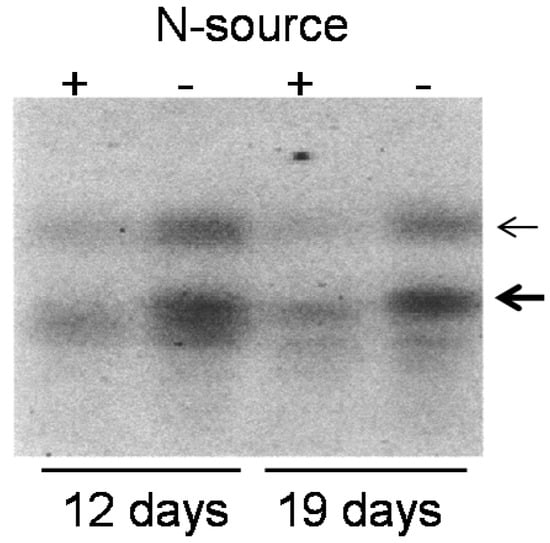 Induction of OsY37 expression under nitrogen starvation conditions. Rice cv. “Akitakomachi” seeds were sown on soil and grown to the juvenile seedling stage. Whole seedlings were transferred to pots containing vermiculite with (+) or without (−) a nitrogen source. After the indicated number of days, RNA (100 μg) was extracted and Northern hybridization analysis was performed as described in Figure 1. Thick and thin arrows correspond to 1 and 3–4 kb transcripts, respectively.