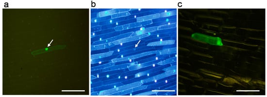 DNA was adsorbed to gold particles (1.0 µm diameter) in 125 µL solution containing 5 µg DNA, 3 mg gold particles, 1 M CaCl2, and 0.016 M spermidine for 3 min at room temperature. The DNA/gold particle complexes were recovered by centrifugation (7000× g, 10 s) and dissolved in ethanol. The entire mixture was placed onto a micro-carrier and air-dried. Onion bulb epidermal peels were placed on basal MSB5 agar plates, composed of MS salts [] supplemented with Gamborg B5 vitamins [], 3% (w/v) sucrose and 0.8% (w/v) BA10 agar (Ina Food, Nagano, Japan). DNA/gold particles were bombarded twice onto the surface of the onion epidermal cells at 1100 psi working with a 900 psi rupture disk under vacuum (28 in. Hg) using a Biolistic PDS-1000/He Particle Delivery System (Bio-RAD, Hercules, CA, USA). The plates were incubated for 16 h of dark condition at 30 °C. The presence of GFP protein was examined by fluorescence microscopy (BX41, OLYMPUS, Nishi-Shinjuku, Tokyo, Japan) under ultraviolet light irradiation with appropriate filters. To visualize nuclei, samples were stained with 10 mL of 1 µg mL−1 4′,6-diamidino-2-phenylindole dihydrochloride (DAPI) dissolved in water for 10 min then viewed using a fluorescence microscope under ultraviolet light irradiation with appropriate filters.