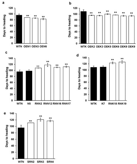 Number of days to heading. Seeds were sown in soil and allowed to grow in a greenhouse under natural photoperiod conditions. Time required from sowing to heading was monitored. Triplicate panicles from single plants were investigated (Student’s t-test, ** p < 0.01). Heading was followed by flowering in average of 2 days (1–3 days). Overexpressing (OE) lines contain CaMV35S::OsY37I construct and repressing (RE) RNAi lines contain CaMV35S::RNAi-OsY37I construct, and SRD(SUPRD)X lines contain OsY37I promoter::OsY37N-SRDX construct. Wild-type Nipponbare (WTN) and Nipponbare OE lines (OEN) (a); wild-type Kinmaze (WTK) and Kinmaze OE lines (OEK) (b); WTN and Nipponbare RNAi lines (RNN) (c); WTK and Kinmaze RNAi lines (RNK) (d); WTN and Nipponbare SRDX lines (SRN) (e).