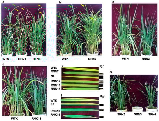 Phenotype of rice plants during senescence. Wild-type and OE lines of Nipponbare (a) and Kinmaze (b) at 20 days after heading of wild-type Nipponbare and Kinmaze plants. Green arrows indicate wild-type flag leaves showing greenish in color, while yellow arrows depict OE lines with yellowing color. Wild-type and RNAi lines of Nipponbare (c) and Kinmaze (d) at 15 days after heading of wild-type. Color development of flag leaves of RNAi lines at 70 days after heading of wild-type plants (e). Lines N5 (Nipponbare) and K7 (Kinmaze) are Hgr− segregates from the primary T0 transformants of RNN5 and RNK7 respectively. Absence of transgene was verified by PCR (polymerase chain reaction) of genomic DNA by using Hgr-specific primers, hph1 and hph2 (e,f, Table 1). SRDX lines of Nipponbare at 20 days after heading of wild-type (g). Names of plant lines are shown in Figure 4.