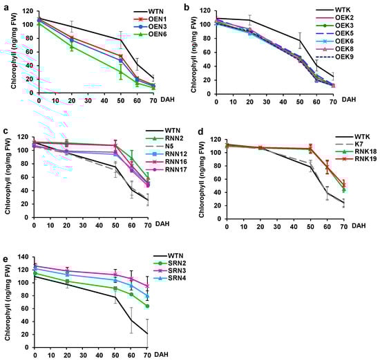 Chlorophyll contents in the flag leaves after heading. Central portions of flag leaves of wild-type and transgenic-lines were excised and the chlorophyll was extracted at the indicated days after heading (DAH). Triplicated samples were analyzed from single plants. Mean values with standard deviations are shown. Wild-type, OE lines of Nipponbare (a) and Kinmaze (b), RNAi lines of Nipponbare (c) and Kinmaze (d), and SRDX lines of Nipponbare (e). Names of plant lines are shown in Figure 4.