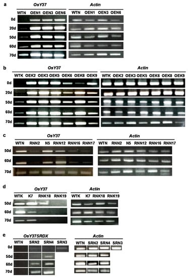 Japonica rice Oryza sativa cv. “Nipponbare” and “Kinmaze” were transformed using the callus method []. Briefly, seeds were husked, surface-sterilized in 2% sodium hypochlorite for 25 min, then cultured on medium supplemented with 2,4-D (2,4-Dichlorophenoxyacetic acid, 1 µg mL−1) and allowed to form callus. The callus was infected with A. tumefaciens strain EHA101 carrying a chimeric plasmid clone in the presence of acetosyringone (10 µg mL−1) and selected for HgrR (50 µg mL−1) resistance. Subsequently, callus was transferred to regenerated to shoots on medium containing NAA (naphthalene acetic acid, 2 ng mL−1), kinetin (2 µg mL−1), and Hgr (50 µg mL−1). T1 generation of OsY37-overexpressing (OE) and OsY37-RNAi lines and primary transformants of OsY37-SRDX lines were subjected to further study.