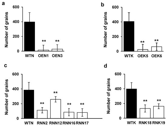 Number of grains in wild-type, OE, and RNAi transgenic lines. Three progenies obtained from the individual transgenic lines were sown and allowed to reach maturity. Matured grains from individual plants were harvested and total grain number was counted. Mean values of grain number from triplicate samples are shown (Student’s t-test, ** p < 0.01). OE lines of Nipponbare (a); Kinmaze (b); RNAi lines of Nipponbare (c); Kinmaze (d). Names of plant lines are shown in Figure 4.