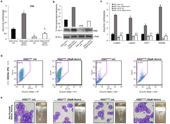 FHC silencing inhibits hemin-induced erythroid differentiation of K562 cells. (a) qRT-PCR and (b) Western Blot analyses of FHC mRNA and protein levels, respectively, in the control K562shScr and FHC-silenced K562shFHC cells untreated (nt) and treated with 50 µM hemin for 48 h; (c) Relative expression of α-globin, γ-globin, CD71 and CD235a of K562shScr and K562shFHC cells untreated or treated with hemin. All data represent mean ± SD (n = 3). * p < 0.05 compared with K562shScr cells, ° p < 0.05 compared with K562shScr cells, § p < 0.05 compared with K562shFHC cells, N.S.: not significant; (d) Flow cytometry analysis of CD235a-positive cells in K562shScr and K562shFHC cells untreated or treated with hemin. Data are reported both as mean fluorescence intensity of CD235a (FL2-H) and as percentage (%) of CD235+ cells; (e) May-Grünwald-Giemsa staining of K562shScr and K562shFHC cell untreated or treated with hemin.