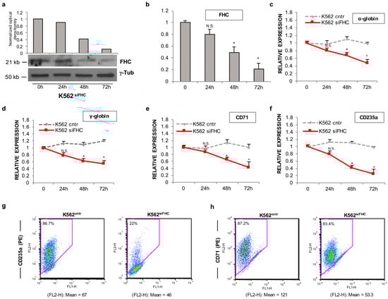 To rule out possible off-target effects of the shRNA, we investigated the expression of α-globin, γ-globin, CD71 and CD235a in K562 cells where FHC expression was transiently silenced by using a specific FHC-siRNA. Figure 2a shows a representative Western Blot of FHC protein levels at 24 h, 48 h and 72 h after the siRNA transfection while in Figure 2b H-ferritin mRNA levels are represented as the mean of three independent experiments. Consistently with the findings obtained in the stably FHC-silenced cells, the qRT-PCR analyses, shown in Figure 2c–f, highlighted a reduction of the erythroid-specific markers upon transient FHC silencing at each time point with a statistical significance at 48 h and 72 h (p < 0.05). Also in these set of experiments CD235a showed the highest responsiveness to FHC knockdown. CD235a and CD71 were further investigated, 72 h upon FHC transient silencing, at the cell surface level: Figure 2g–h report representative FACS analyses that highlight markedly reduced levels of both markers in K562siFHC cells compared to the control ones (CD235a, FL2-H mean: 46 vs. 67; % CD235a+: 22 vs. 86.7) (CD71, FL2-H mean: 53.3 vs. 121, CD71+: 83.4 vs. 87.2).