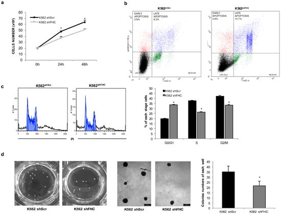 We recently found that FHC knockdown restrains K562 cell proliferation []. Because the proliferation rate of a given cell population can be correlated to its differentiation state, here, by using direct cell counting assays, we re-confirmed the decline of K562shFHC proliferative rate in comparison with control cells at 24 h (37 × 104 vs. 48 × 104) and 48 h (51 × 104 vs. 64 × 104) (Figure 3a). Using flow cytometry and Annexin V/7-AAD double staining, we assayed apoptosis of K562shScr and K562shFHC cells and found that FHC silencing slightly increased late apoptosis (Annexin V+/7-AAD+, 6.2% vs. 13.7%, p < 0.05), but not early apoptosis (Annexin V+/7-AAD−, 2.8% vs. 3.8%) (Figure 3b). The analysis of cell cycle, using PI staining and flow cytometric detection, further confirmed the presence of a higher percentage of K562shFHC cells in the G0/G1 phase as compared to control K562shScr cells (33.6% vs. 19.9%, p < 0.05) (Figure 3c). The moderate extent of the FHC silencing-induced G0/G1 cell cycle arrest, in comparison with the strong interference with the erythroid commitment, makes it difficult to correlate these two phenomena. Proliferation and differentiation can either be coupled or inversely correlated in function on the differentiation stage [], thus further studies are needed to deeply investigate this point. Finally, through clonogenic assays we found that K562shFHC cells displayed an approximately 2-fold decrease of clonogenic potential as compared to the control cells, as shown by representative microscopy images and quantified in the histogram (p < 0.05) (Figure 3d).