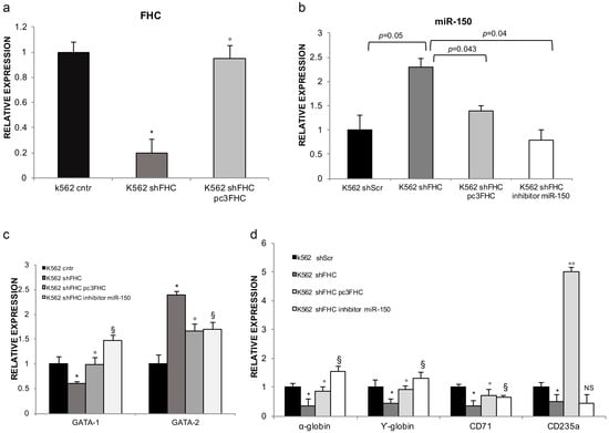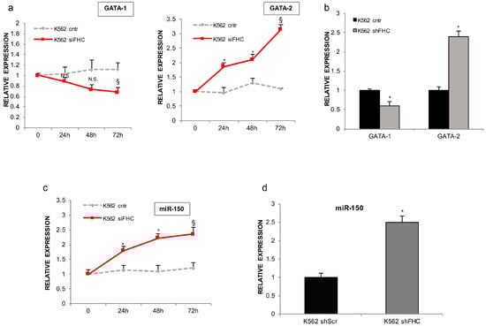 FHC silencing reduces GATA-1 and induces miR-150 up-regulation. (a) qRT-PCR analysis of GATA-1 and GATA-2 genes in transiently FHC-silenced K562siFHC cells at 0 h, 24 h, 48 h, and 72 h, compared to control K562cntr cells. All data represent mean ± SD (n = 3). * p < 0.05 compared with K562cntr at 24 h; ° p < 0.05 compared with K562cntr at 48 h; § p < 0.05 as compared with K562cntr at 72 h. N.S. not significant; (b) qRT-PCR analysis of GATA-1 and GATA-2 genes in stably FHC-silenced K562shFHC cells compared to control K562shScr cells. All data represent mean ± SD (n = 3). * p < 0.05 compared with K562shScr cells; (c) TaqMan analysis of miR-150 in transiently FHC-silenced K562siFHC cells at 0 h, 24 h, 48 h, and 72 h, compared to control K562cntr cells. All data represent mean ± SD (n = 3). * p < 0.05 compared with K562cntr at 24 h; ° p < 0.05 compared with K562cntr at 48 h; § p < 0.05 compared with K562cntr at 72 h; (d) TaqMan analysis of miR-150 in stably FHC-silenced K562shFHC cells compared to control K562shScr cells. All data represent mean ± SD (n = 3). * p < 0.05 compared with K562shScr cells.