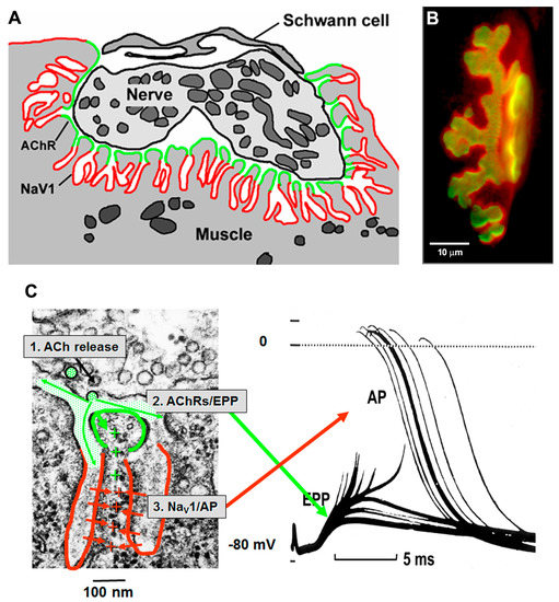 Postsynaptic folds and the anatomy of mAP generation. (A) Diagram of ion channel distribution at a rat NMJ. AChRs (green) are concentrated at the crests of the folds, while NaV1.4 channels are concentrated in the depths of the folds; (B) Fluorescence of rat NMJ showing AChRs (green) and NaV1.4 channels (red). Note that the NaV1.4 labeling protrudes beyond the AChRs because the NaV1.4 channels are located in the depths of the folds; (C) Anatomy of mAP generation. (1) ACh release from the nerve occurs next to the region of high AChR density (green); (2) This allows positive ions to enter the muscle, giving rise to the EPP; (3) The depolarization of the EPP opens the NaV1.4 channels in the depths of the folds, allowing a much bigger influx of positive ions which triggers that mAP. (From Slater, 2017, with permission) [21].