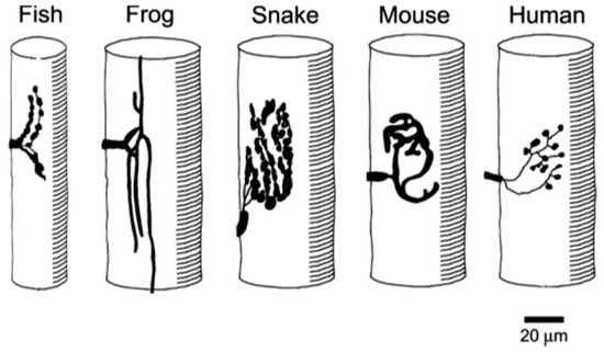 In addition to the broad, inter-Phylum, trends just described, there are also clear trends within the Vertebrates. The conformation of vertebrate NMJs varies considerably from species to species (Figure 5).