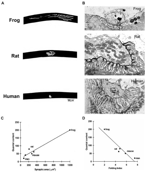 Correlations of structure and function in vertebrate NMJs. (A) Fluorescence images of frog, rat and human NMJs, labelled with α-bungarotoxin. Note that the human NMJ is much smaller than the other two; (B) EM images of NMJs in the same species. Note that the extent of postsynaptic folding increases from frog to human; (C) Quantal content is related to synaptic area in the vertebrate species studied; (D) Quantal content is related inversely to the extent of folding (folding index, FI).