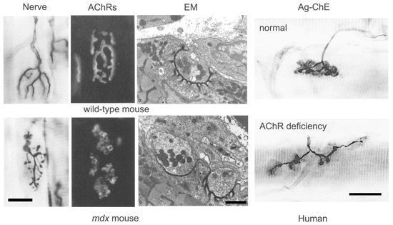 - Lyons, P.R.; Slater, C.R. Structure and function of the neuromuscular junction in young adult mdx mice. J. Neurocytol. 1991, 20, 969–981. [Google Scholar] [CrossRef] [PubMed]