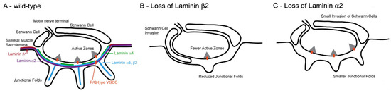 Laminins at the mammalian NMJ. Diagrams of the distribution of various laminin forms at normal and abnormal mouse NMJs. (A) Wild type; (B) Loss of laminin β2; (C) Loss of laminin α2. Note that in the absence of laminin β2, there are almost no folds and the Schwann cell extends into the synaptic cleft. The loss of laminin α2 causes similar, but less dramatic changes. (Adapted from Rogers and Nishimune, 2016, with permission) [67].