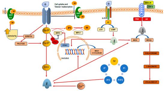 - Nayak, B.; Kondeti, V.K.; Xie, P.; Lin, S.; Viswakarma, N.; Raparia, K.; Kanwar, Y.S. Transcriptional and post-translational modulation of myo-inositol oxygenase by high glucose and related pathobiological stresses. J. Biol. Chem. 2011, 286, 27594–27611. [Google Scholar] [CrossRef] [PubMed]