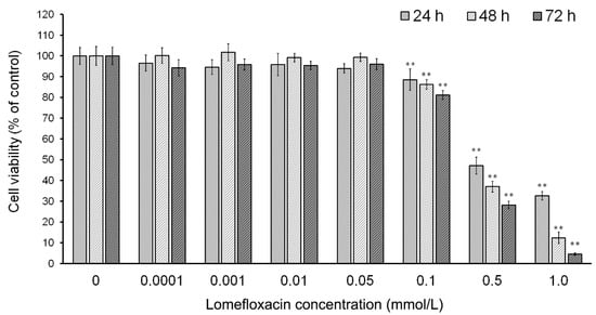 The effect of lomefloxacin on the viability of COLO829 melanoma cells. The cells were treated with various lomefloxacin concentrations (0.0001–1.0 mmol/L) for 24, 48, and 72 h and examined by the WST-1 (4-[3-(4-iodophenyl)-2-(4-nitrophenyl)-2H-5-tetrazolio]-1,3-benzene disulphonate) assay. Data are expressed as percentages of the controls. Mean values ± standard error of the mean (SEM) from three independent experiments (n = 3) performed in triplicate are presented. ** p < 0.005 versus control samples.
