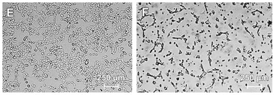 Lomefloxacin induces morphological changes in COLO829 melanoma cells: control COLO829 cells incubated for (A) 24 h, (C) 48 h, and (E) 72 h; cells exposed to lomefloxacin at a concentration of 1.0 mmol/L for (B) 24 h, (D) 48 h, (F) and 72 h. The cells were observed under a light inverted microscope at 40× magnification (scale bar 250 µm).