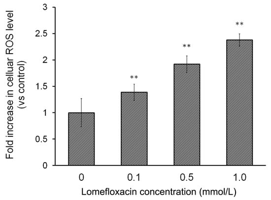 H2DCFDA staining was used to detect ROS generation in COLO829 cells exposed to lomefloxacin treatment. As shown in Figure 3, the exposure of COLO829 cells to lomefloxacin leads to ROS overproduction in a concentration-dependent manner. The treatment of cells with lomefloxacin at concenrations 0.1, 0.5, and 1.0 mmol/L for 24 h enhanced ROS production by 38%, 93%, and 137%, respectively, in comparison to the untreated cells (controls).