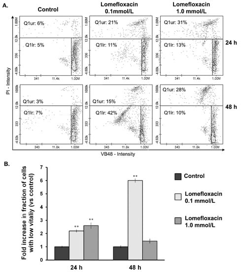 The analysis of the level of cellular thiols in COLO829 cells was performed by the use of the fluorescence image cytometer from NucleoCounter NC-3000 (Allerod, Denmark). The COLO829 cells were seeded in T-75 flasks at a density of 2 × 106 cells per flask. The treatment with lomefloxacin in concentrations 0.1 mmol/L and 1.0 mmol/L began 24 h after seeding. After 24 or 48 h of incubation, the cells were harvested by trypsinization, loaded into Via-1-Casette, and counted using a NucleoCounter NC-3000 image cytometer. 1.0 × 106 cells were suspended in 1.0 mL of culture medium, and one volume (10 µL) of Solution 5 (which contains AO that stains all cells, PI that stains dead cells only, and VB-28TM that stains viable cells in an intensity-dependent manner to the level of thiols) was added into 19 volumes (190 µL) of the cell suspension. The stained cells were loaded into an NC-Slide A8 and measured using the Vitality assay protocol in the NucleoCounter NC-3000 image cytometer. The obtained histograms were used to demarcate the percentages of PI negative cells with low vitality (low level of cellular thiols), PI negative cells with high vitality (healthy cells), and PI positive cells (dead cells).