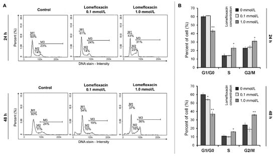 Cell cycle analysis of COLO829 cells exposed to lomefloxacin. (A) Histograms presenting the cell cycle distribution in cells exposed to lomefloxacin in concentrations of 0.1 and 1.0 mmol/L for 24 and 48 h. The presented histograms are representative of three independent experiments with similar results. The effect of the drug on the cell cycle distribution was investigated by a fluorescence image cytometer after DAPI (4′,6-diamidino-2-phenylindole) staining. M1G1/G0 phase; M2—S-phase; M3—G2/M phase. (B) The effect of lomefloxacin on the cell cycle distribution in COLO829 cells. The cells were treated with lomefloxacin at concentrations of 0.1 and 1.0 mmol/L for 24 and 48 h. Mean values ± SEM from three independent experiments (n = 3) performed in triplicate are presented. * p < 0.05 versus control samples; ** p < 0.005 versus control samples.