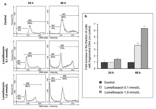 Lomefloxacin induces DNA fragmentation in COLO829 melanoma cells. (A) Histograms presenting the induction of DNA fragmentation in cells exposed to lomefloxacin at concentrations of 0.1 and 1.0 mmol/L for 24 and 48 h. The presented histograms are representative of three independent experiments with similar results. The effect of the drug on DNA fragmentation was investigated by a fluorescence image cytometer after DAPI staining. M1—cells having less than one DNA equivalent (so-called sub-G1 cells); M2—cells having one or more than one DNA equivalent. (B) The effect of lomefloxacin on DNA fragmentation in COLO829 cells. The cells were treated with lomefloxacin at concentrations of 0.1 and 1.0 mmol/L for 24 and 48 h. Mean values ± SEM from three independent experiments (n = 3) performed in triplicate are presented. ** p < 0.005 versus control samples.