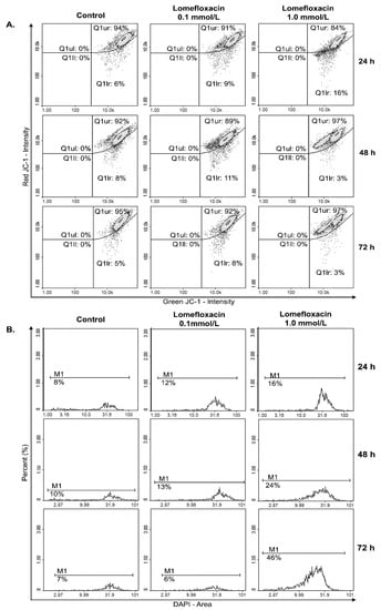 Lomefloxacin induces apoptosis in the COLO829 melanoma cell line. The cells treated with lomefloxacin in concentrations of 0.1 and 1.0 mmol/L for 24, 48, and 72 h were stained with (A) JC-1 and (B) DAPI dyes and analyzed by a fluorescence image cytometer. The presented histograms are representative of three independent experiments with similar results.