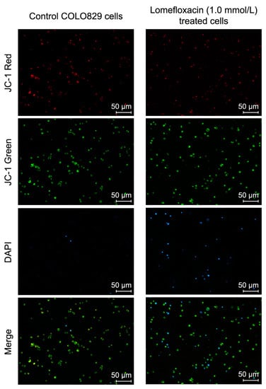The mitochondrial transmembrane potential (∆Ψm) was measured by the use of the fluorescence image cytometer NucleoCounter NC-3000 (Denmark). The COLO829 cells were seeded in T-75 flasks at a density of 2 × 106 cells per flask. Lomefloxacin treatment in concentrations of 0.1 mmol/L and 1.0 mmol/L began 24 h after seeding. After 24, 48, or 72 h of incubation, the cells were harvested by trypsinization, loaded into Via-1-Casette, and counted using a NucleoCounter NC-3000 image cytometer. To 1.0 × 106 cells, 12.5 µL of Solution 7 was added, and the cells were incubated for 15 min at 37 °C. The stained cells were then centrifuged at 400× g for 5 min and washed twice with PBS. The cell pellets were re-suspended in 0.25 mL of Solution 8 (which contains DAPI in PBS) and analyzed immediately using the NC-Slide A8 and Mitochondrial Potential Assay protocol in the NucleoCounter NC-3000 image cytometer. The cellular blue (DAPI), green, and red (JC-1) fluorescence was quantified. The cells with collapsed mitochondrial potential exhibited a decrease in their red/green fluorescence intensity ratio. The obtained scatter-plots and histograms were used to demarcate the percentages of polarized/healthy cells, depolarized/apoptotic cells, and DAPI positive/late apoptotic or necrotic cells.