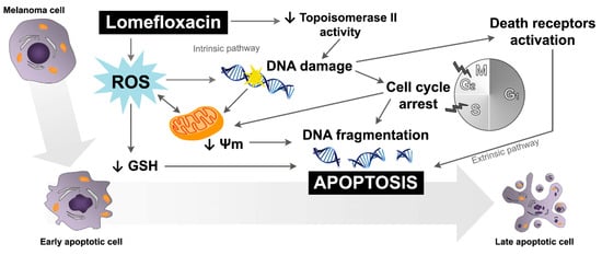 The induction of apoptosis is the main mechanism through which a number of chemotherapeutic agents inhibit cancer cell proliferation. The obtained results provide strong experimental evidence indicating the high cytotoxic activity of lomefloxacin towards COLO829 melanoma cells. The cytotoxic response was found to be mediated by the disruption of redox balance, S- and G2/M-phase cycle arrest, the breakdown of the mitochondrial membrane potential, and the induction of DNA fragmentation, which trigger drug-induced apoptosis in COLO829 cells (Figure 9). Moreover, when compared with normal human melanocytes, lomefloxacin demonstrates higher cytotoxic activity towards COLO829 melanoma cells than do normal pigmented cells. To the best of our knowledge, this provides, for the first time, an important molecular basis for the pharmacologic effect underlying high lomefloxacin cytotoxic activity towards human melanoma cells and gives a new insight into the therapeutic properties of this drug. The obtained results also support the hypothesis that 6,8-difluoroquinolones may be considered a class of drugs with targeted effects on tumor cells and may constitute a basis for the development of new fluoroquinolone derivatives with potential anticancer activity []. With further investigation regarding lomefloxacin preclinical and clinical efficacy, the presented findings could be considered as a potential anti-melanoma therapy.