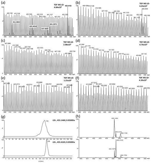 - Pirkl, A.; Meier, M.; Popkova, Y.; Letzel, M.; Schnapp, A.; Schiller, J.; Dreisewerd, K. Analysis of Free Fatty Acids by Ultraviolet Laser Desorption Ionization Mass Spectrometry Using Insect Wings as Hydrophobic Sample Substrates. Anal. Chem. 2014, 86, 10763–10771. [Google Scholar] [CrossRef] [PubMed]