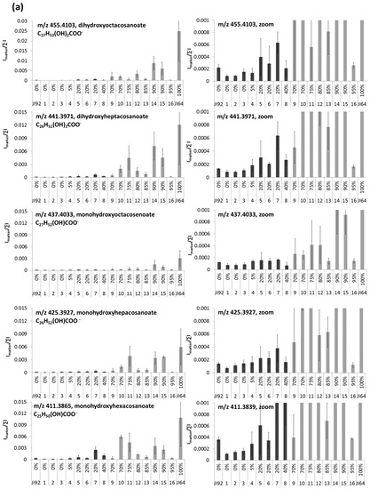 - Kerwin, J.L.; Torvik, J.J. Identification of Monohydroxy Fatty Acids by Electrospray Mass Spectrometry and Tandem Mass Spectrometry. Anal. Biochem. 1996, 237, 56–64. [Google Scholar] [CrossRef] [PubMed]