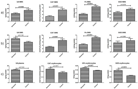 Non-enzymatic and enzymatic antioxidants in non-stimulated (a) and stimulated (b) saliva as well as plasma/erythrocytes (c) of dementia patients and the control group. Abbreviations: CAT, catalase; NWS, non-stimulated whole saliva; Px, salivary peroxidase; GPx, glutathione peroxidase; SOD, superoxide dismutase-1; SWS, stimulated whole saliva, UA, uric acid.