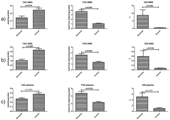 Total antioxidant/oxidant status in non-stimulated (a) and stimulated (b) saliva as well as plasma (c) of dementia patients and the control group. Abbreviations: NWS, non-stimulated whole saliva; OSI, oxidative stress index; SWS, stimulated whole saliva; TAC, total antioxidant capacity; TOS, total oxidant status.