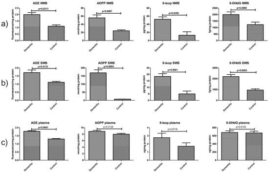 Oxidative damage to proteins, lipids and DNA in non-stimulated (a) and stimulated (b) saliva as well as plasma (c) of dementia patients and the control group. Abbreviations: 8-isop, 8-isoprostanes; 8-OHdG, 8-hydroxy-2′-deoxyguanosine; AGE, advanced glycation end products; AOPP, advanced oxidation protein products; NWS, non-stimulated whole saliva; SWS, stimulated whole saliva.