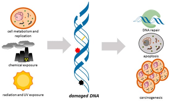 - Chatterjee, N.; Walker, G.C. Mechanisms of DNA damage, repair, and mutagenesis. Environ. Mol. Mutagen. 2017, 58, 235–263. [Google Scholar] [CrossRef] [PubMed]