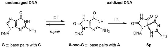 When guanine is oxidized, forming 8-oxoguanine (8-oxo-G), the resulting preferential basepairing to A ultimately leads to a G to T tranversion mutation. Further oxidation results in the spiroiminodihydantoin (Sp) adduct diastereomers, for example, which are highly destabilizing to the DNA duplex.