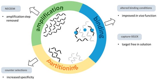Conceptual representation of classic Systematic Evolution of Ligands by EXponential enrichment (SELEX) and important modifications. Classic SELEX consists of iterative rounds of binding, partitioning and PCR amplification. Single-stranded DNA or RNA libraries are incubated with the target-of-interest (blue circles). A partitioning step removes non-specific sequences (light grey strands). PCR amplification is then used to make multiple copies of the selected sequences (dark grey). Modifications to the classic SELEX process to isolate aptamers for DNA damage and repair targets include: the use of “capture-SELEX” for small molecules allowing them to be selected without immobilization; altered binding conditions to improve binding to strand breaks and improving activity in vivo; rigorous counter selection to ensure binding specificity; and the use of NECEEM for difficult protein targets.