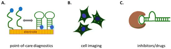 Conceptual figure highlighting potential applications of aptamers for DNA damage and repair. (A) Aptamers (green strands) could be incorporated into several platforms to create rapid analysis or point-of-care diagnostic kits to measured DNA lesion levels; (B) Aptamers combined with RNA tools such as “Spinach” could replace antibodies in cell imaging (allowing fluorescent imaging (bright dots) of damage/ repair proteins inside cells); (C) Highly specific aptamers (green strand) that inhibit repair proteins and polymerases (brown shape) could be used in cancer treatment and gene therapy.