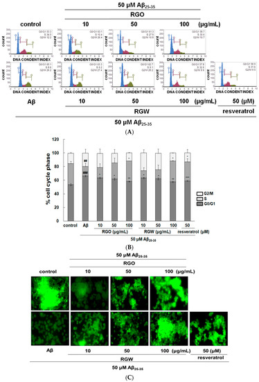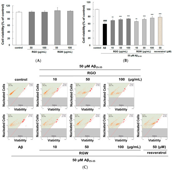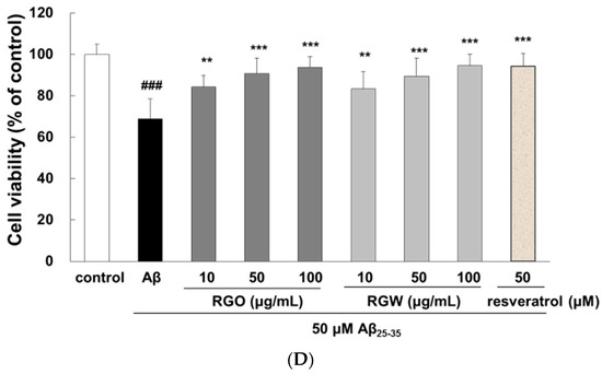An automated cell count and cell viability analysis was performed using double DNA intercalating fluorescent dyes by the Muse cell analyzer (Figure 1C,D). Aβ25–35treatment (50 μM) decreased PC12 cell viability to 68.8 ± 9.6% (p < 0.001), but this was substantially increased to 84.4 ± 5.5%, 90.8 ± 7.4%, and 93.8 ± 5.1% by pretreatment with RGO at 10, 50, and 100 μg/mL, respectively. RGW pretreatment (50 and 100 μg/mL) also increased the cell viability to 89.5 ± 8.8% and 94.5 ± 5.6%, respectively. The results indicated that RGO had a similar cytoprotective effect in Aβ25–35-damaged PC12 cells as that of RGW.