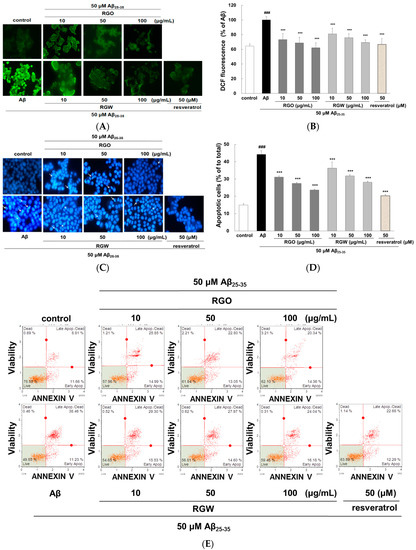 RGO and RGW inhibited Aβ25–35-stimulated intracellular reactive oxygen species (ROS) and apoptosis. PC12 cells were treated with samples for 1 h (10, 50, and 100 μg/mL) and further added with Aβ25–35 for 24 h. ROS generation of PC12 cells observed with CM-H2DCFDA (×400) (A) and measured by microplate reader (B). PC12 cell apoptosis was stained with Hoechst 33342 and imaged by fluorescence microscopy (C). Quantification of apoptotic cell (D). The flow cytometry images of apoptosis observed with Annexin V-7AAD (E). Percentage of early and late apoptotic cells (F). ### p < 0.001 compared to control group; *** p < 0.001 and ** p < 0.01 compared to Aβ25–35 alone (ANOVA followed by Duncan’s multiple comparison test). Resveratrol was used as a positive control.