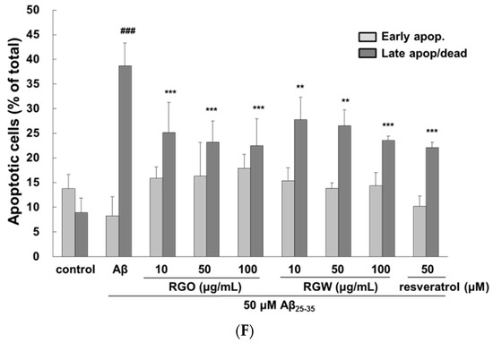 To measure the inhibitory property of RGO against Aβ25–35-stimulated apoptosis, PC12 cells were dyed with Hoechst 33342 and viewed under a fluorescence microscope (Figure 2C). Aβ25–35-stimulated apoptosis of PC12 cells was characterized by marked chromatin condensation. However, after pretreatment of RGO or RGW in addition of Aβ25–35, the number of apoptotic cells clearly decreased. As shown in Figure 2D, 50 μM Aβ25–35 increased the incidence of cellular apoptosis to 43.11 ± 1.64% in comparison with the control group (14.64 ± 0.73%), whereas pretreatment with RGO decreased the incidence of apoptosis to 31.10 ± 0.67%, 27.50 ± 0.54%, and 23.68 ± 0.43% at 10, 50, and 100 μg/mL, respectively. RGW reduced the rate of apoptosis to 45.39 ± 2.08%, 36.25 ± 3.53%, and 31.75 ± 0.84% at 10, 50, and 100 μg/mL, respectively. The ratio of early and late apoptotic cells was evaluated using flow cytometry after annexin V and 7-AAD staining [20]. The percentage of late apoptosis cells in the control sample was 8.9 ± 2.9%, whereas Aβ25–35 treatment significantly increased this to 38.7 ± 4.6% (p < 0.001). The increase in the late apoptotic cells was decreased by treatment with RGO, particularly at 10, 50, and 100 μM (to 25.1 ± 6.1%, 23.2 ± 6.1%, and 22.4 ± 5.6%, respectively). RGW also decreased the proportion of cells late apoptosis at 10, 50 and 100 μM (27.7 ± 4.6, 26.5 ± 3.2%, 23.5 ± 0.9%, respectively; Figure 2E,F).