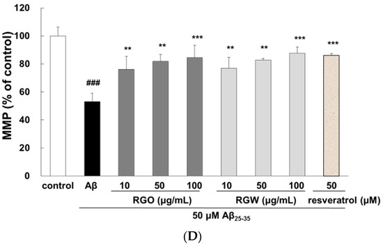 The depolarization of mitochondria is considered an initial and irreversible step of apoptosis. To evaluate this, the MMP was determined by the evaluation of rhodamine fluorescence [24]. After Aβ25–35 exposure, MMP of PC12 cells was significantly reduced to 53.1 ± 5.9% compared with that of the control (100 ± 6.3%). However, the MMP was markedly recovered in the cells pretreated with RGO or RGW (100 μg/mL) by up to 84.4 ± 9.0% or 87.6 ± 4.6%, respectively (Figure 3C,D).