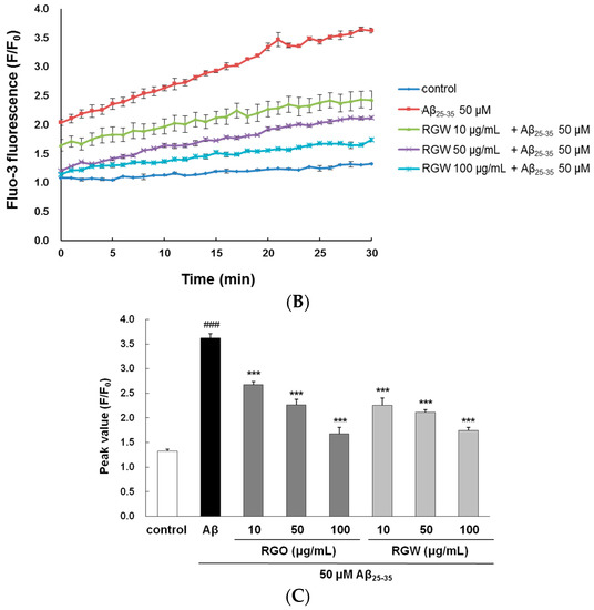 RGO (A) and RGW (B) ameliorated Aβ25–35-induced intracellular calcium levels ([Ca2+]i). Histogram showing the peak values of [Ca2+]i (C). The graph indicates calcium levels the as described in Materials and Methods. ### p < 0.001 compared to control group; *** p < 0.001 compared to Aβ25–35 alone (ANOVA followed by Duncan’s multiple comparison test).